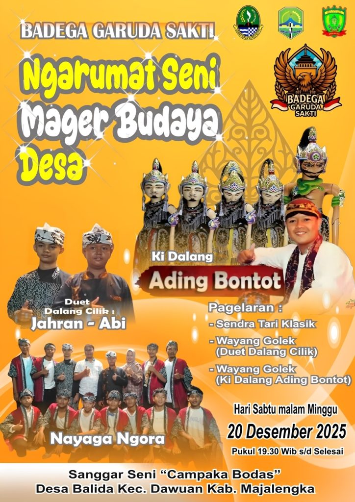 INFOPOLISI.NET | BANDUNG – Yayasan Badega Garuda Sakti bersama Sanggar Seni Campaka Bodas akan mengadakan pagelaran Wayang Golek di Kabupaten Majalengka pada Minggu, 20 Desember 2025, pukul 19.30 di Kp. Campaka Desa Balida Kecamatan Dawuan Kabupaten Majalengka.