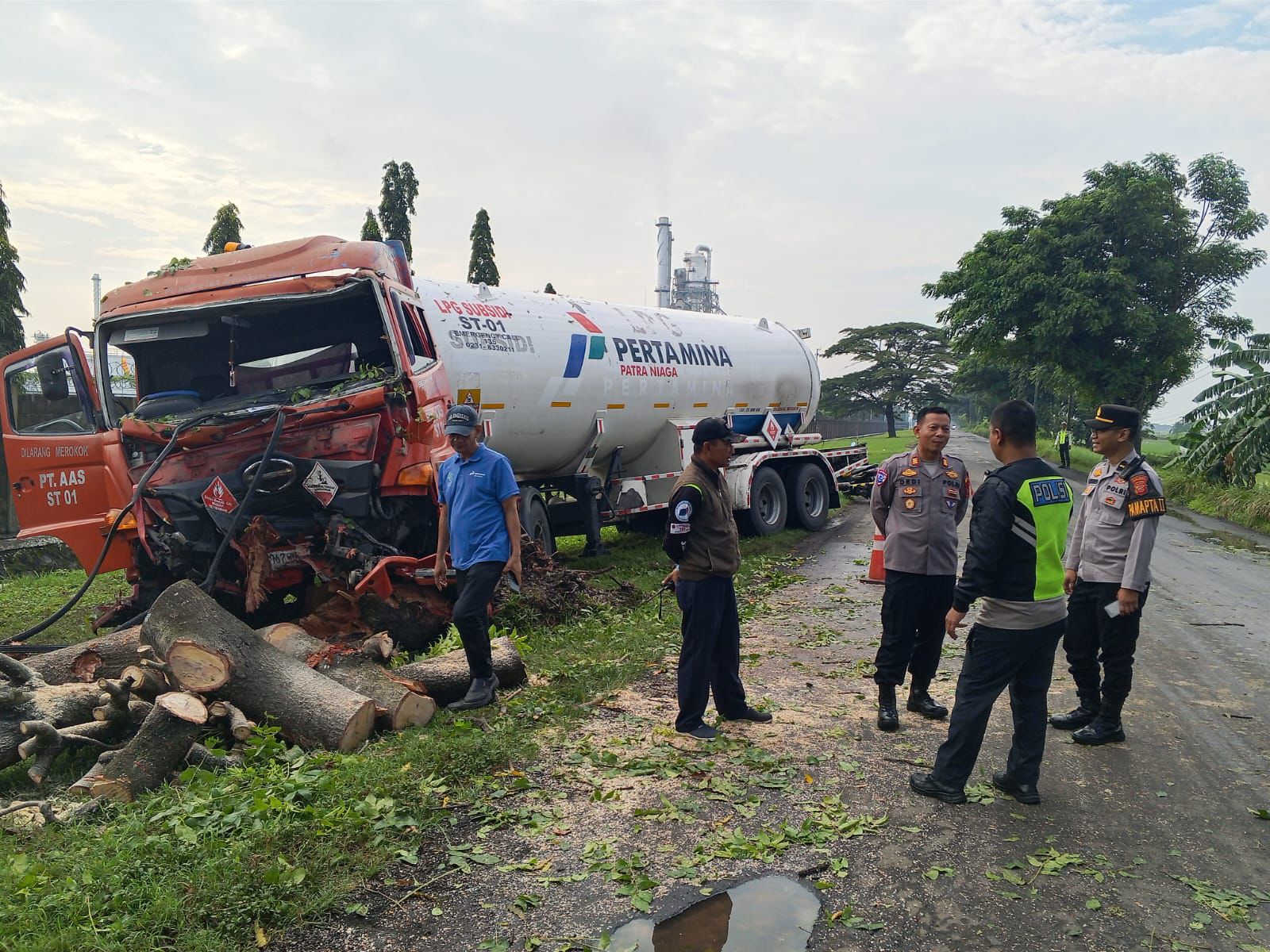 Kecelakaan tunggal yang terjadi sekira pukul 03.30 WIB ini melibatkan mobil tangki Elpiji dengan