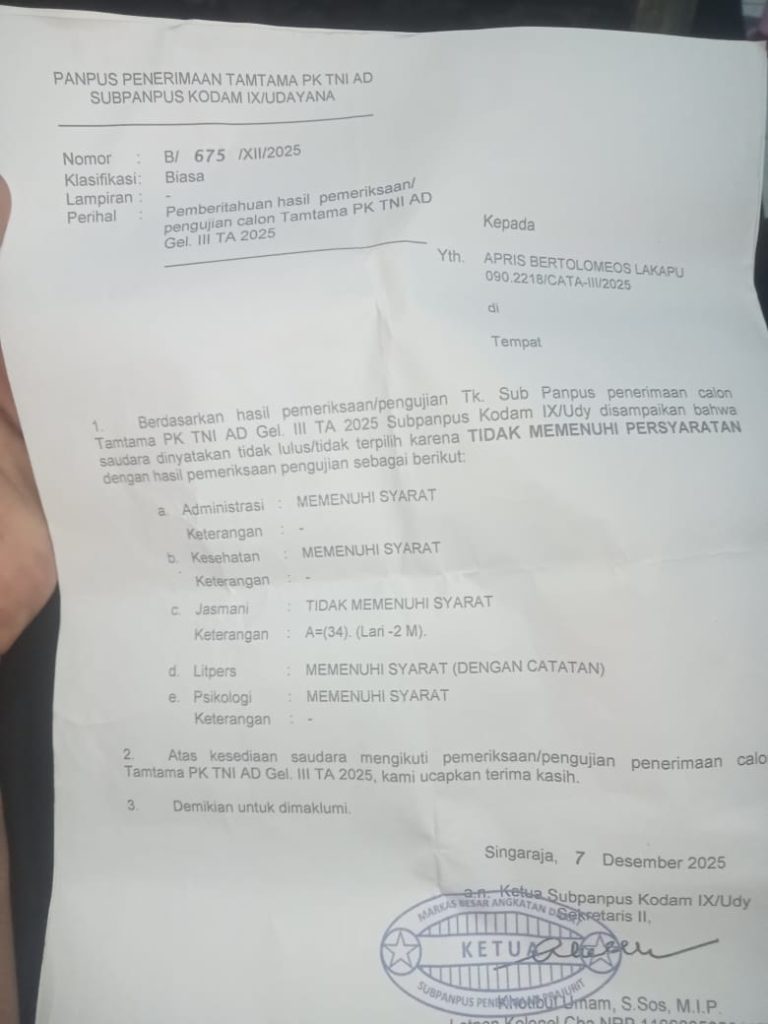 Apris, pemuda kelahiran Kiu Tuif pada 15 April 2005, diketahui mengikuti seleksi penerimaan Tamtama PK TNI AD Gelombang III Tahun 2025 melalui SUBPANPUS Kodam IX/Udayana di Singaraja, Bali. Namun, langkahnya harus terhenti pada tahapan seleksi PANPUS karena adanya persyaratan yang belum dapat dipenuhi.