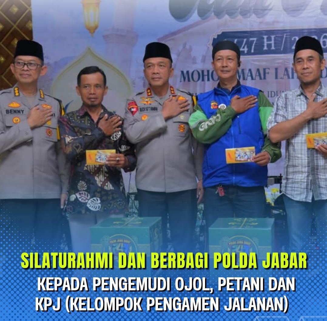 INFOPOLISI.NET | JABAR – Kapolda Jawa Barat Irjen Pol. Dr. Rudi Setiawan, S.I.K., S.H., M.H. didampingi para Pejabat Utama (PJU) Polda Jabar melaksanakan kegiatan Silaturahmi Idul Fitri dan Berbagi Kepedulian Polda Jabar kepada para pengemudi ojek online (ojol), petani, serta KPJ (Kelompok Pengamen Jalanan). Kegiatan tersebut dilaksanakan pada Minggu, 22 Maret 2026, bertempat di Aula Masjid Al-Amman Polda Jabar.
