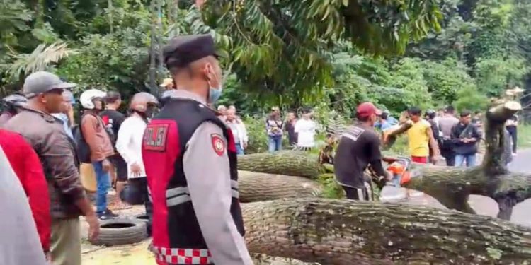 Bersama unsur terkait dan warga sekitar, petugas kemudian memotong serta menyingkirkan batang pohon dari badan jalan hingga arus lalu lintas kembali normal.