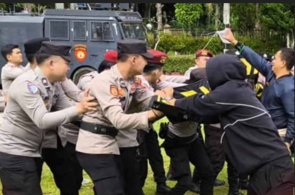 Personel dengan perlengkapan tameng didukung unit Raimas dan tim bermotor bersiaga, termasuk kehadiran tim tindak yang bergerak cepat mengamankan oknum yang berperilaku anarkis dalam skenario tersebut.